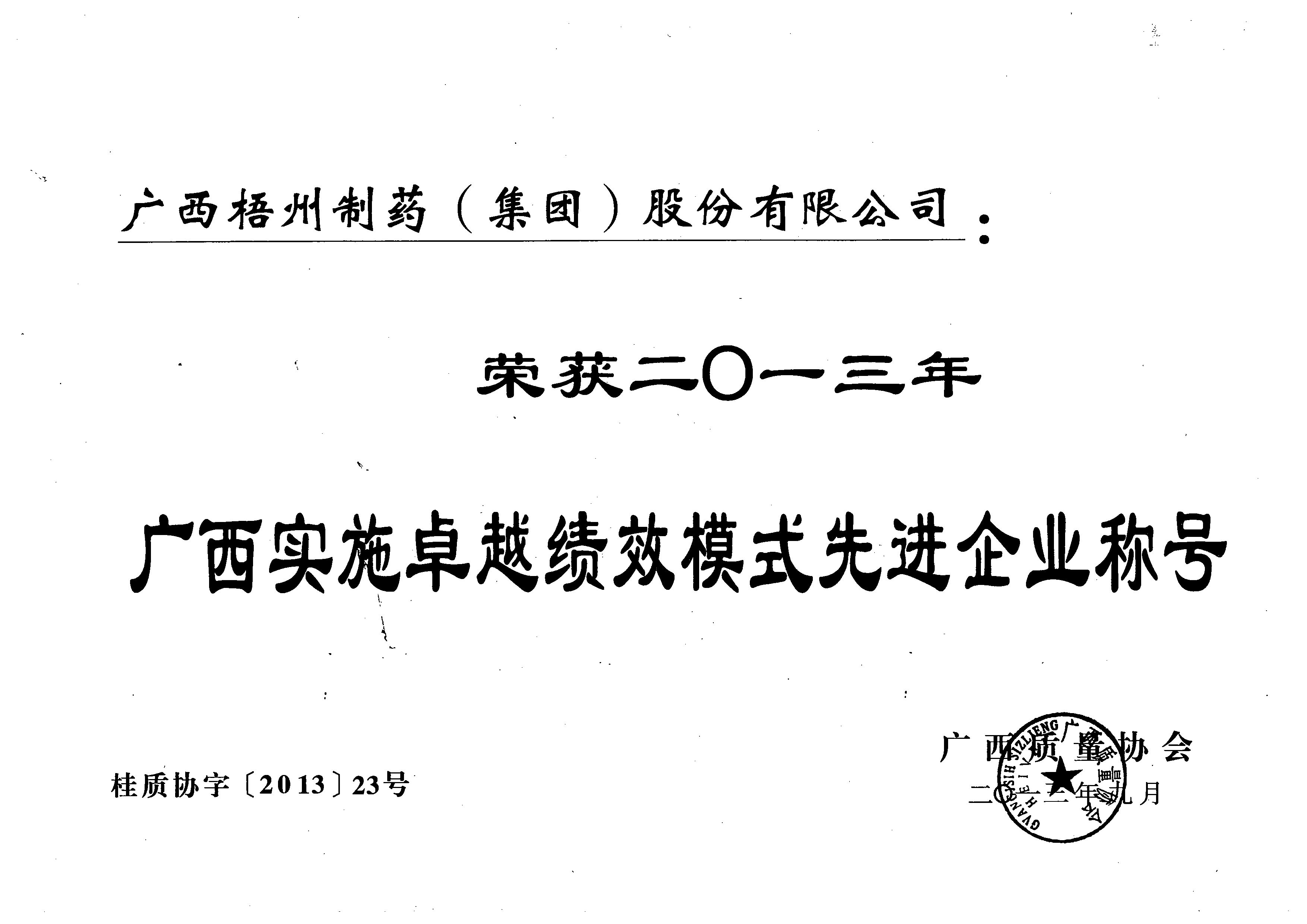 榮獲2013年廣西實施卓越績效模式先進(jìn)企業(yè)稱號
