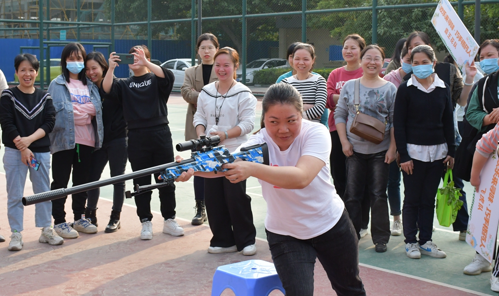 完成“尋寶”任務(wù)的女職工們,即可變身“巾幗槍手”。射擊點上“陀槍師姐”們手握氣槍,精力高度集中,沉著冷靜?!把b彈、上膛、瞄準(zhǔn)、擊發(fā)”,各個環(huán)節(jié)操作嚴(yán)謹(jǐn),舉手投足間盡顯颯爽英姿,彰顯了女職工們無畏險阻,奮楫前行的巾幗本色。當(dāng)“子彈”擊破氣球響亮的爆破聲在球場內(nèi)陣陣響起,現(xiàn)場笑聲、鼓掌聲此起彼伏。大家在射擊中瞬間放松了心情,緩解了工作壓力,同時為活動增添了濃厚的節(jié)日氣氛。