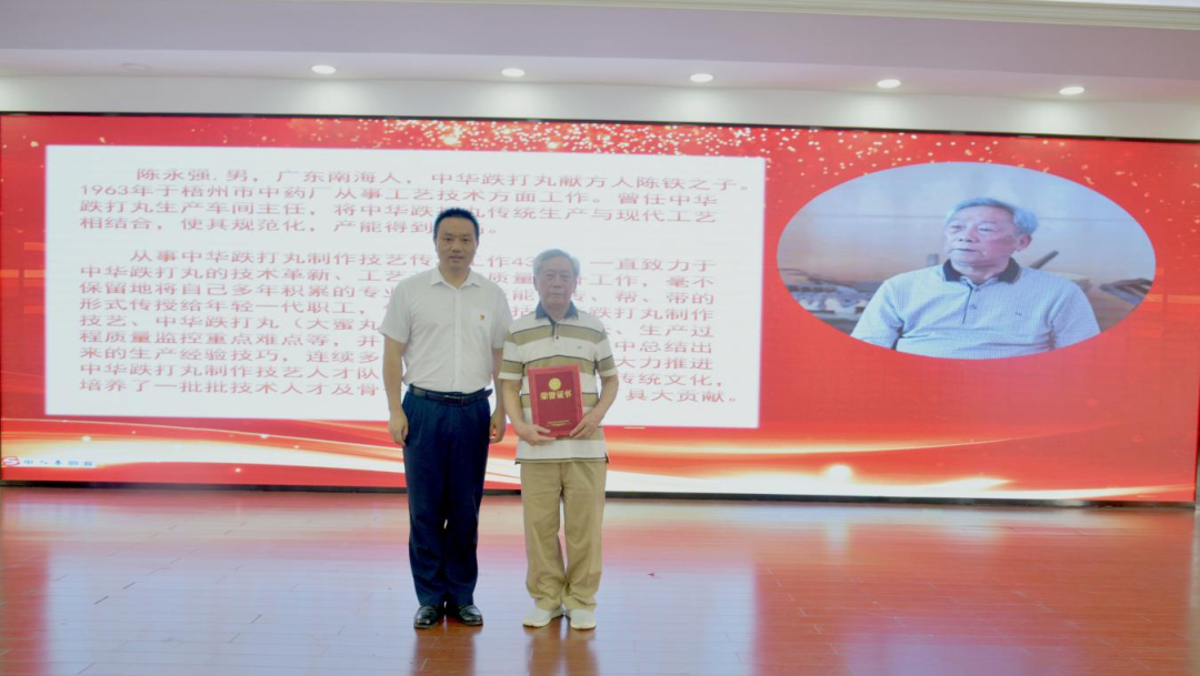 活動還專門邀請了中華跌打丸獻方人陳鐵的兒子,現(xiàn)已83歲高齡的原跌打丸生產(chǎn)車間主任陳永強到會,由公司黨委書記、董事長黃文彩為其頒發(fā)“中華跌打丸制作技藝——金牌師父”榮譽稱號。“中華跌打丸制作技藝”的第三、第四、第五代非遺傳承人依次上臺,同樣用傳統(tǒng)的束脩六禮對陳老進行了謝師,以此來表達對師父的感激之情、教導(dǎo)之恩。